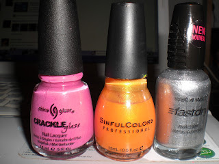This is what I used. CG crackle Broken Hearted, Sinful Colors Cloud 9 and Wet 'n Wild Silvivor.